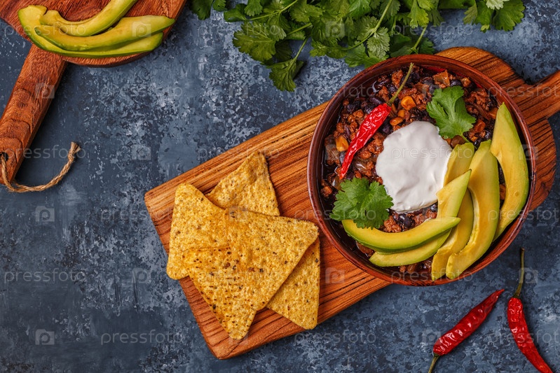 Чили кон карне в миске с авокадо и сметаной