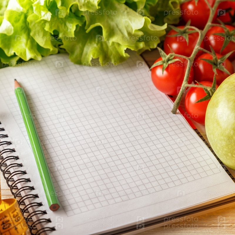 Свежие органические овощи и фрукты, открытая пустая тетрадь и ручка