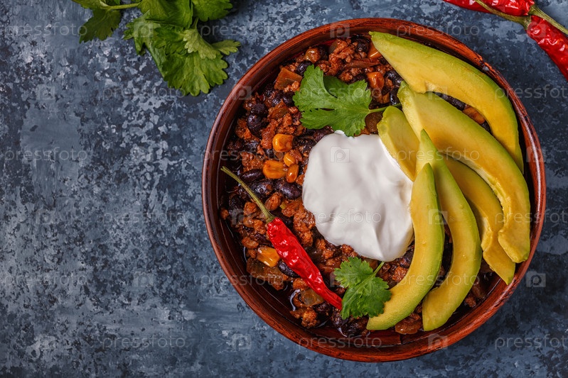 Чили кон карне в миске с авокадо и сметаной
