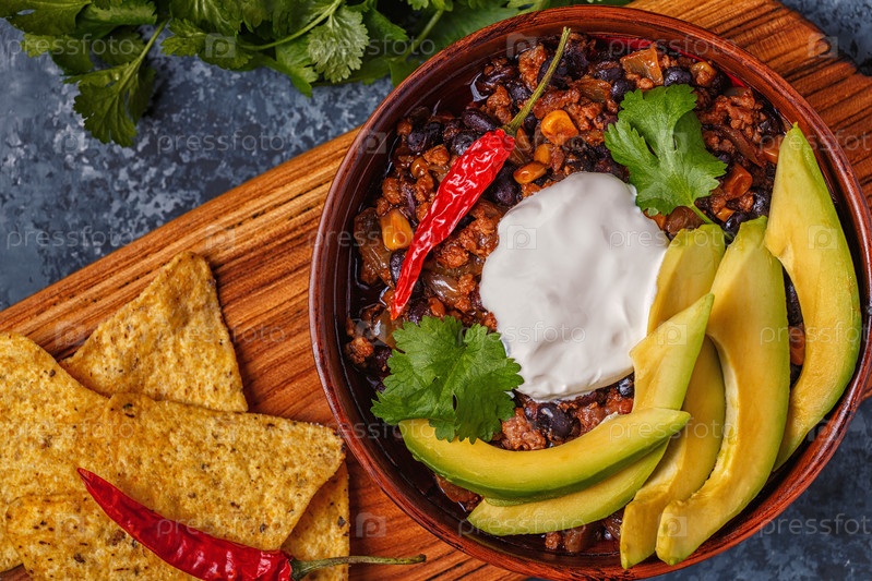 Чили кон карне в миске с авокадо и сметаной