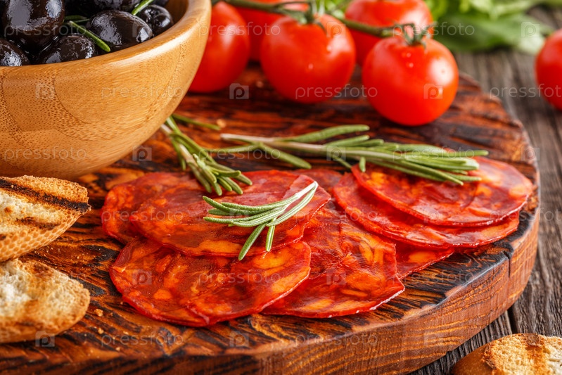 Испанская традиционная колбаса чоризо со свежими травами, оливками,