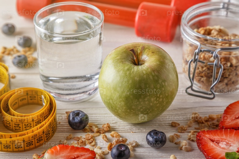 Здоровый завтрак, гантели и измерительная лента на деревянном фоне