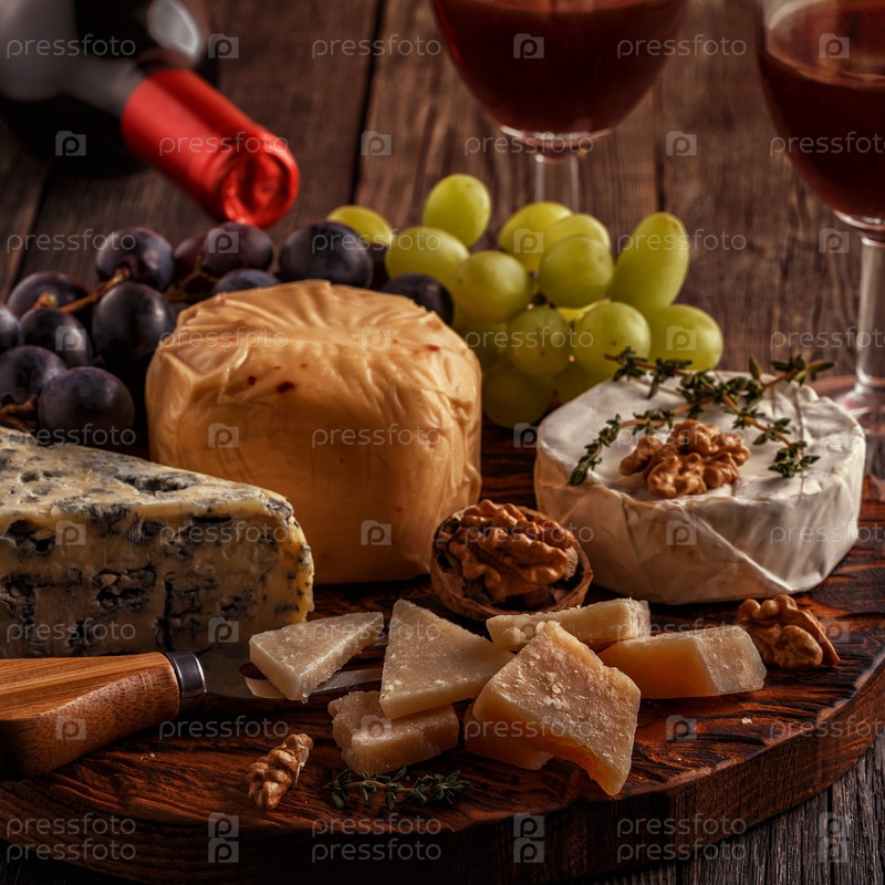 Сыр, орехи, виноград и красное вино на деревянном фоне