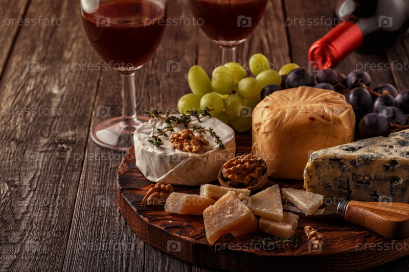 Сыр, орехи, виноград и красное вино на деревянном фоне
