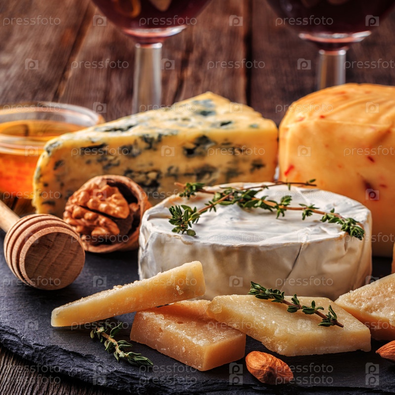 Сыр, орехи, мед и красное вино на деревянном фоне