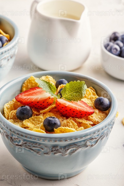 Здоровый завтрак - кукурузные хлопья с фруктами и ягодами