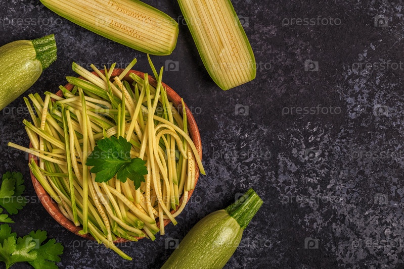 Сырые макароны из цуккини на темном фоне