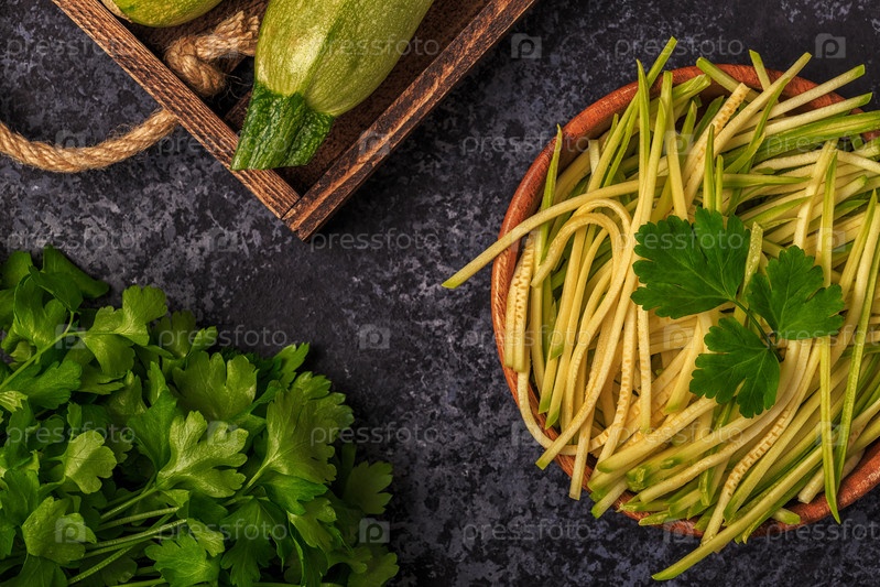 Сырые макароны из цуккини на темном фоне