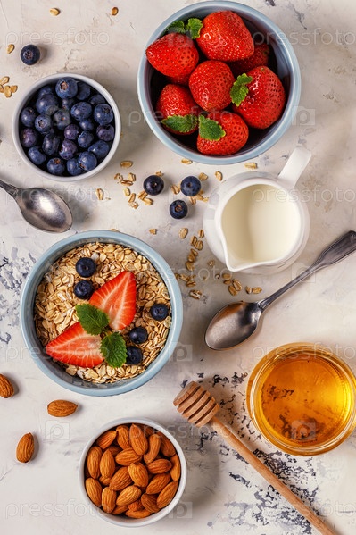 Здоровый завтрак - миска овсянки, ягод и фруктов, вид сверху