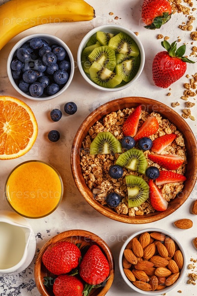 Здоровый завтрак - чаша мюсли, ягод и фруктов