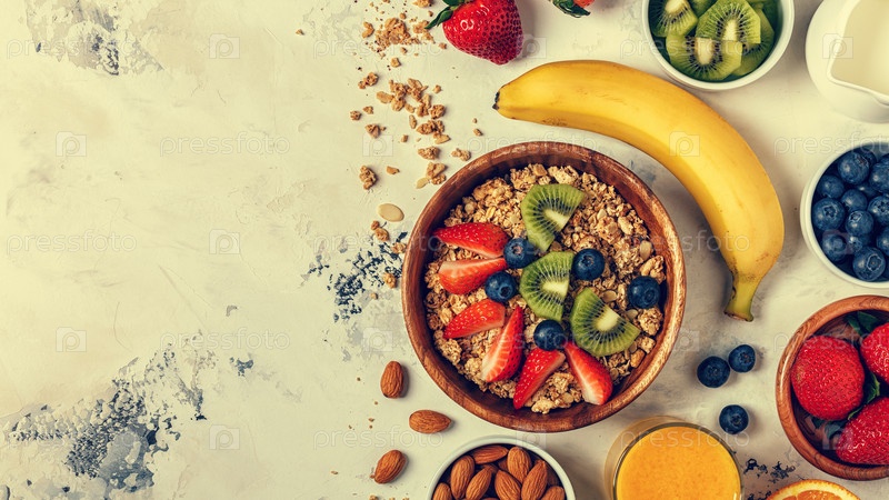 Здоровый завтрак - чаша мюсли, ягод и фруктов