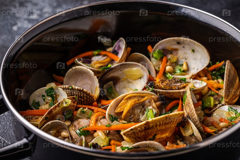 Раковины моллюсков вонголе с овощами и зеленью