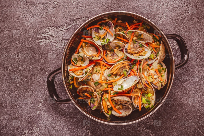Раковины моллюсков вонголе с овощами и зеленью