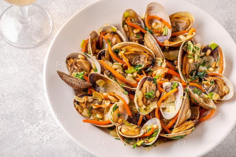 Раковины моллюсков вонголе с овощами и зеленью