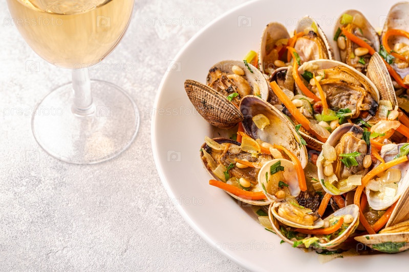 Раковины моллюсков вонголе с овощами и зеленью
