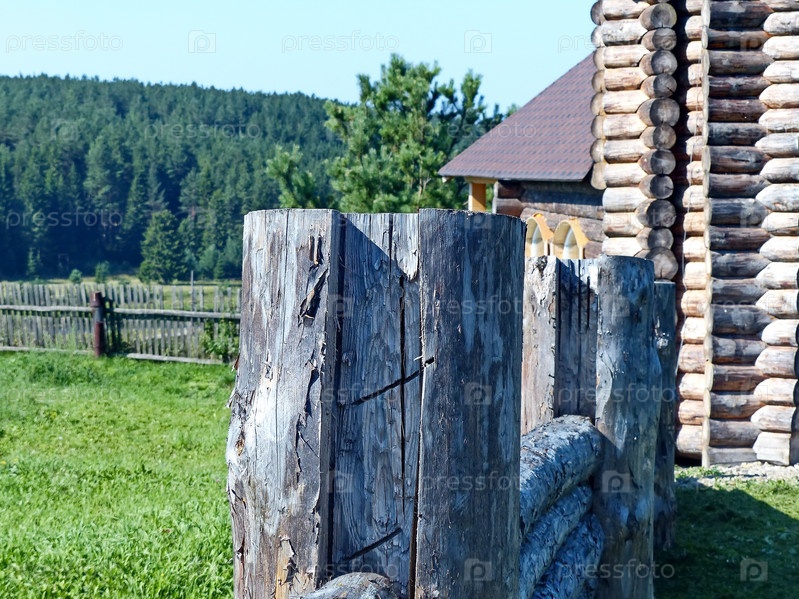 Фасад крестьянской хижины (XVII век) и массивный бревенчатый забор Музей-заповедник деревянной архитектуры и народного творчества Нижняя Синячиха, Россия