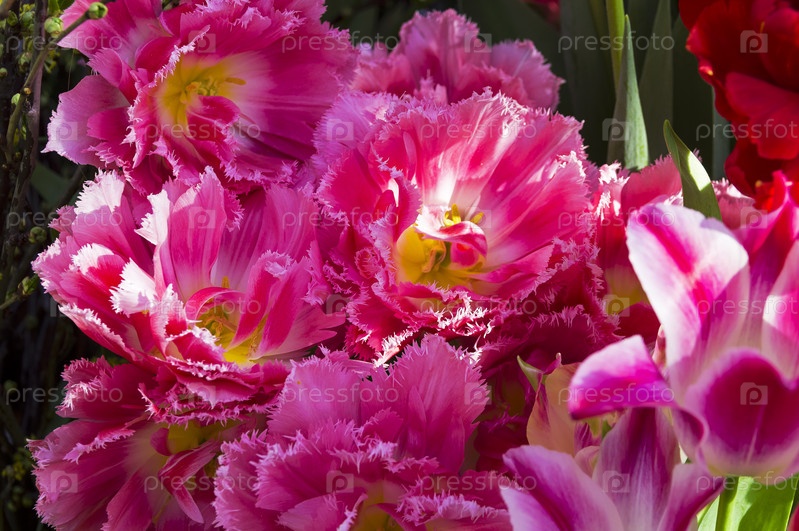 Яркие бахромчатые темно-розовые тюльпаны крупным планом. Традичионная ежегодная выставка "Репетиция весны" в в Аптекарском Огороде (филиал ботанического сада МГУ). Москва
