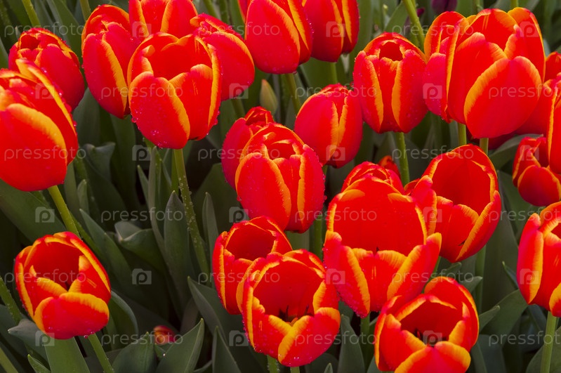 Яркие красно-желтые тюльпаны. Традичионная ежегодная выставка "Репетиция весны" в в Аптекарском Огороде (филиал ботанического сада МГУ). Москва