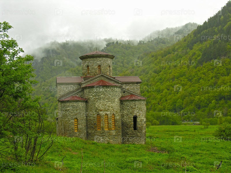 Средний Зеленчукский храм. Нижне-Архызское городище, долина реки Большой Зеленчук, Карачаево-Черкессия. Пасмурный день в мае