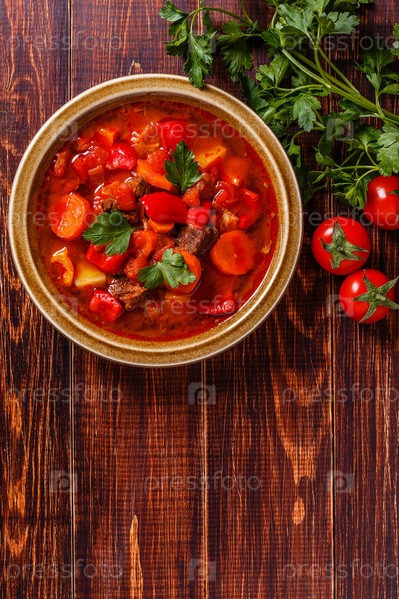 Гуляш или тушеное мясо в миске с петрушкой на деревянном фоне