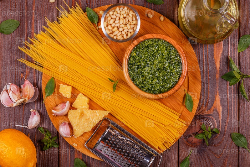 Песто из зеленого базилика - ингредиенты итальянского рецепта на деревянном столе