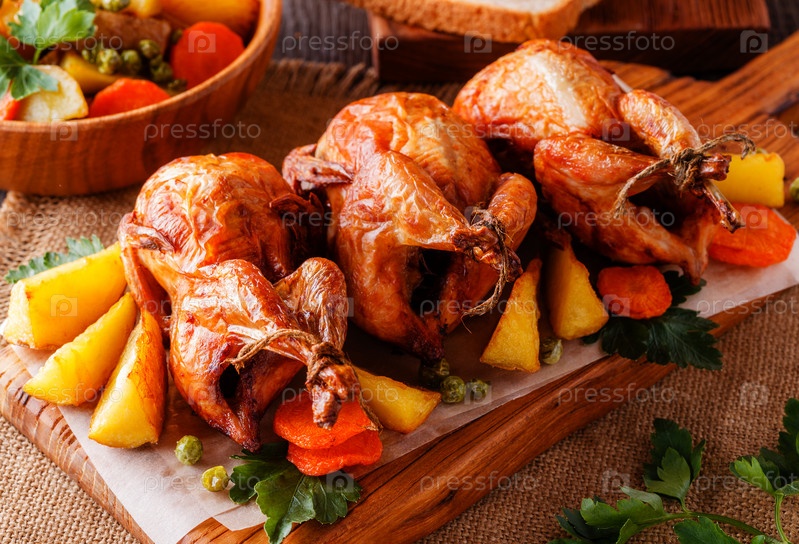 Жареный перепел с овощами на сервировочной доске