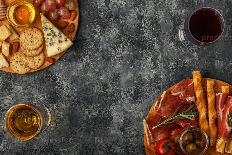 Выбор закусок из сыра и мяса, вид сверху