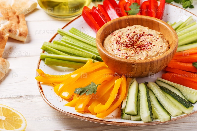 Домашний хумус с ассорти из свежих овощей и лавашом
