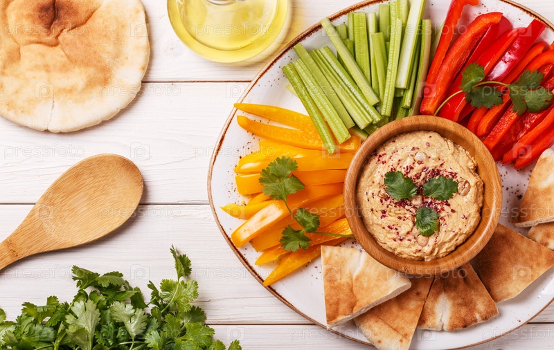 Домашний хумус с ассорти из свежих овощей и лавашом
