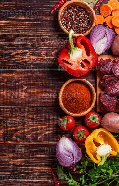 Ингредиенты для приготовления гуляша или тушеного мяса: сырое мясо, травы, специи, овощи на темном деревянном фоне