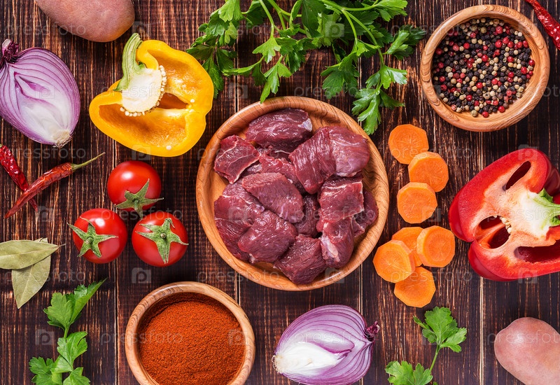 Ингредиенты для приготовления гуляша или тушеного мяса: сырое мясо, травы, специи, овощи на темном деревянном фоне
