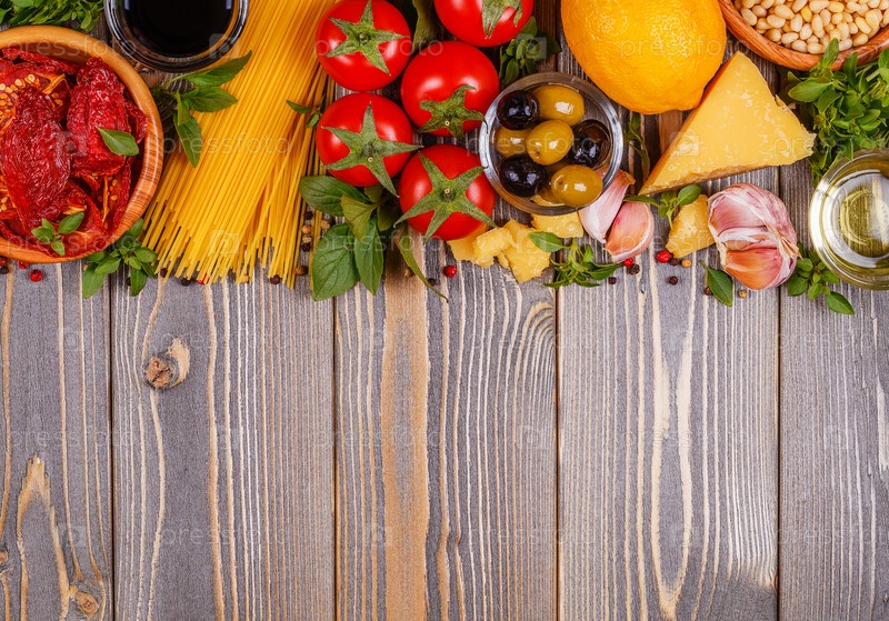 Фон итальянской кухни - ингредиенты на деревянном столе