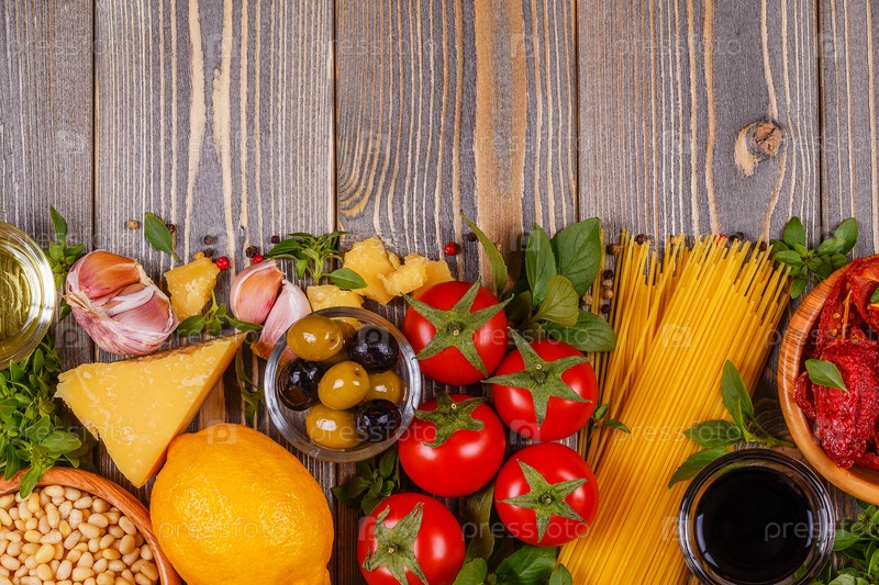 Фон итальянской кухни - ингредиенты на деревянном столе