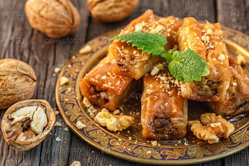 Традиционный арабский десерт пахлава с медом и грецкими орехами