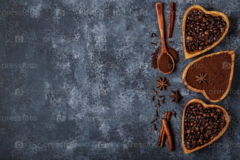Вид сверху на кофейные зерна, молотый кофе и специи