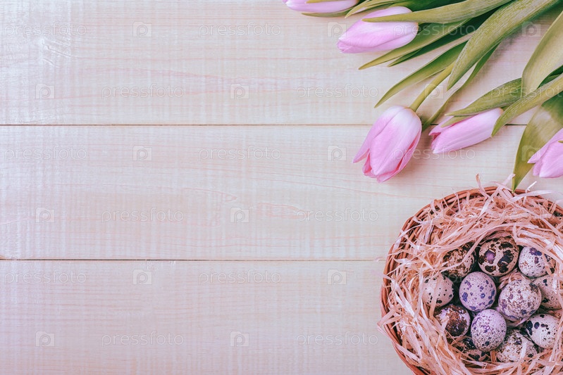Пасхальный фон розовые тюльпаны на деревянном столе, перепелиные яйца, гнездо