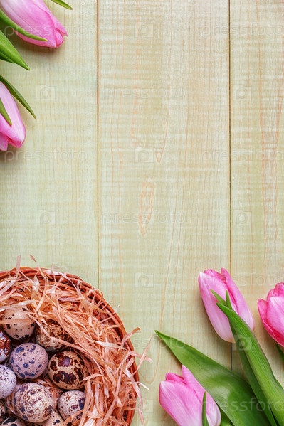 Пасхальный фон розовые тюльпаны на деревянном столе, перепелиные яйца, гнездо