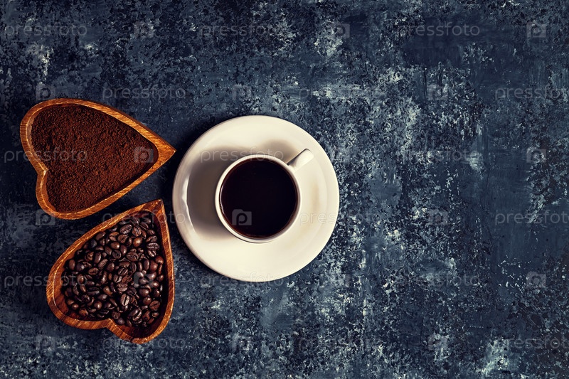 Кофейная чашка, бобы и молотый порошок на каменном фоне