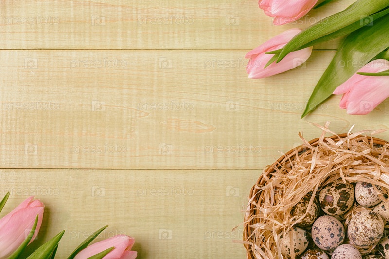Пасхальный фон розовые тюльпаны на деревянном столе, перепелиные яйца, гнездо