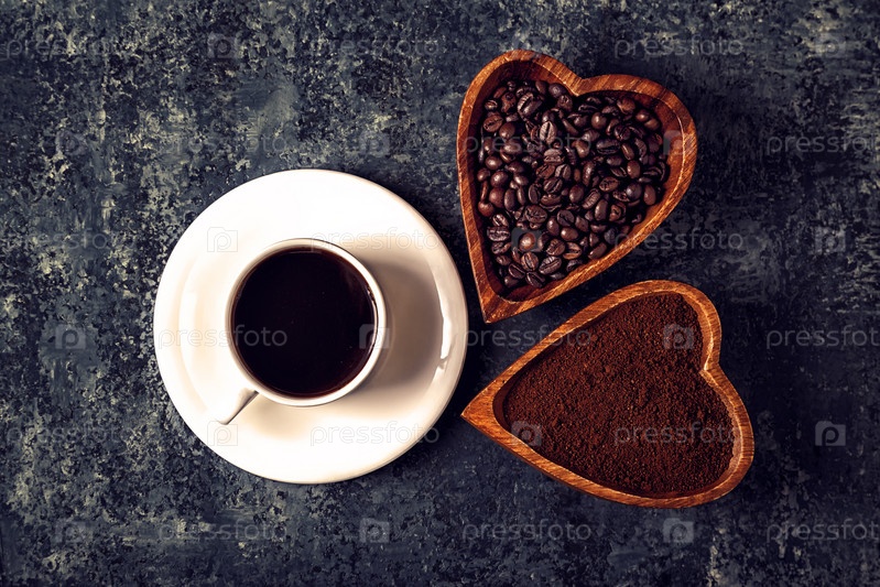 Кофейная чашка, бобы и молотый порошок на каменном фоне