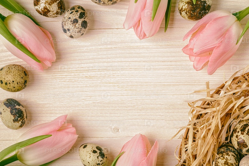 Пасхальный фон розовые тюльпаны на деревянном столе, перепелиные яйца, гнездо