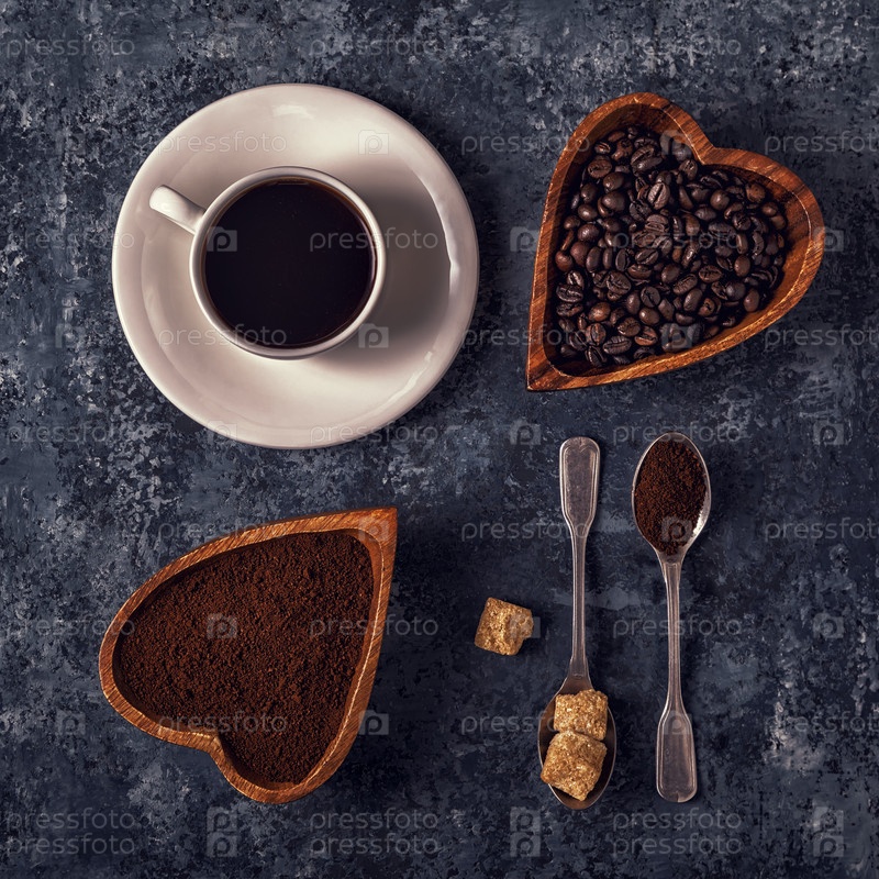 Кофейная чашка, бобы и молотый порошок на каменном фоне