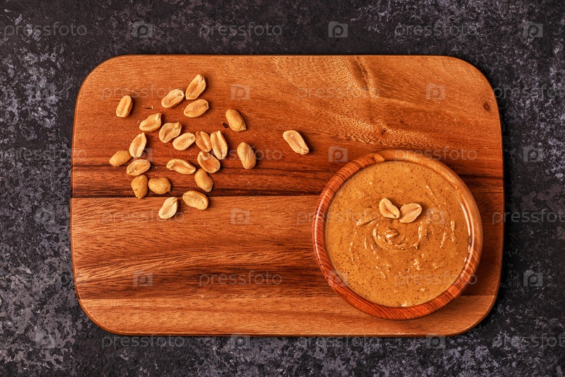 Чаша арахисового масла на деревянной доске