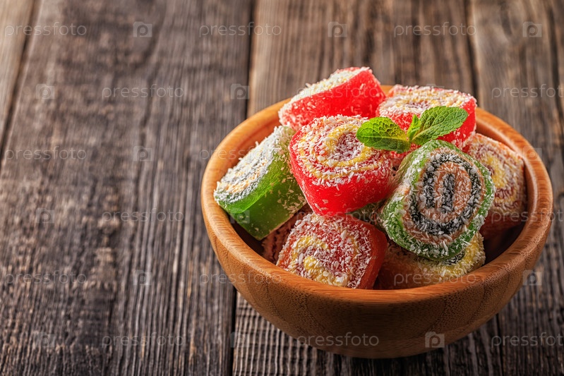 Рахат-лукум на темном деревянном фоне