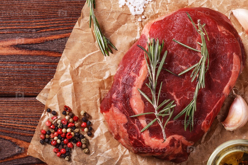 Стейк рибай из сырого свежего мяса и приправа