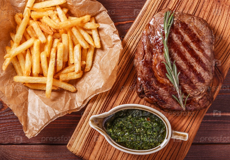 Стейк рибай барбекю из говядины с соусом чимичурри и картофелем фри