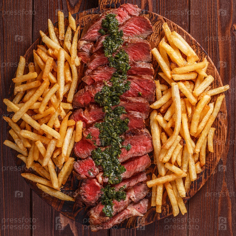 Стейк рибай барбекю из говядины с соусом чимичурри и картофелем фри