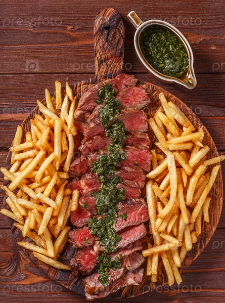 Стейк рибай барбекю из говядины с соусом чимичурри и картофелем фри