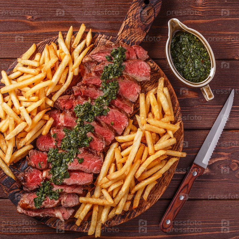 Стейк рибай барбекю из говядины с соусом чимичурри и картофелем фри