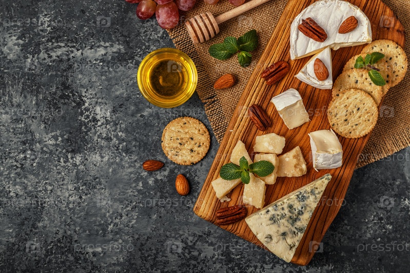 Ассорти из сыра с медом, орехами и виноградом на разделочной доске
